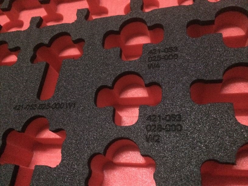 Naast bedrijfslogo’s kunnen we ook teksten of nummers op de interieurs laseren zodat bijvoorbeeld plaatsing van een bepaald product kan worden aangegeven. De scherpste laserprints kunnen gemaakt worden op fijncellige schuimsoorten zoals LD33, LD45 en XPE-soorten.