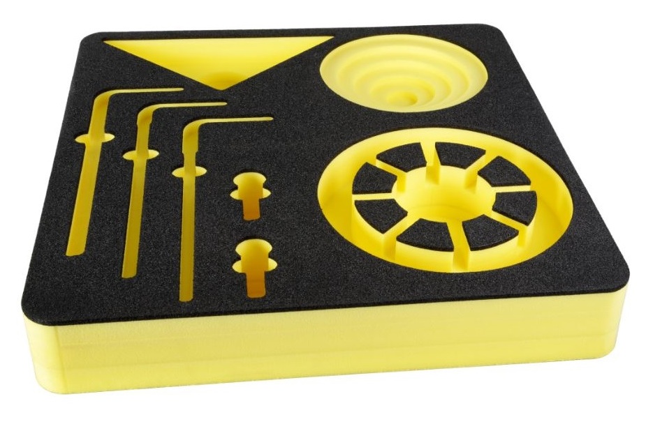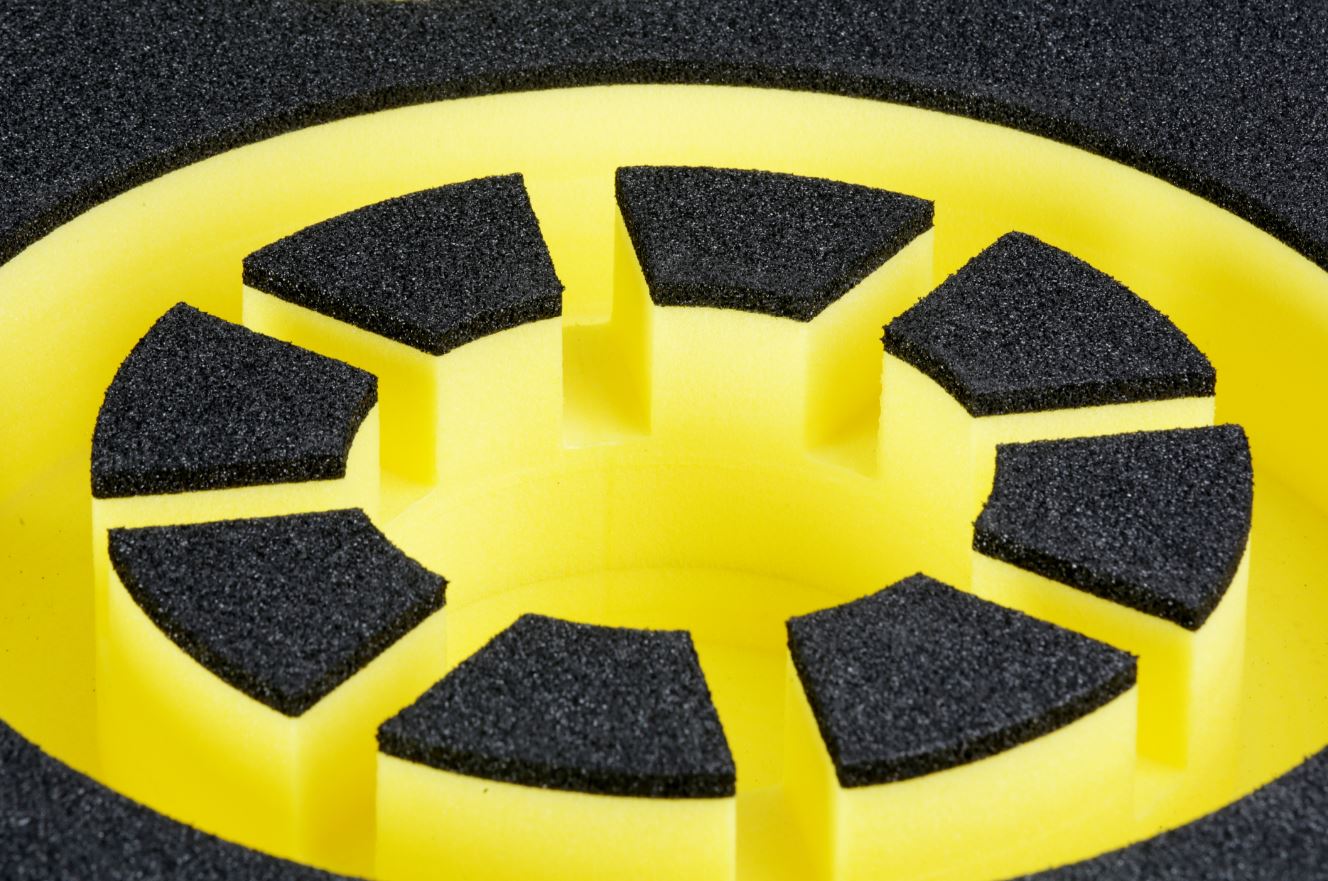 Vooral bij hardere schuimstoffen Alveobloc (NA36), Plastazote (LD29/PE29) en XPE (XPE30) is stansen gecompliceerder bij de dikkere schuimblokken. Als alternatief voor productie van dikkere schuiminterieurs en kleinere aantallen gebruiken we onze waterstraalmachines.